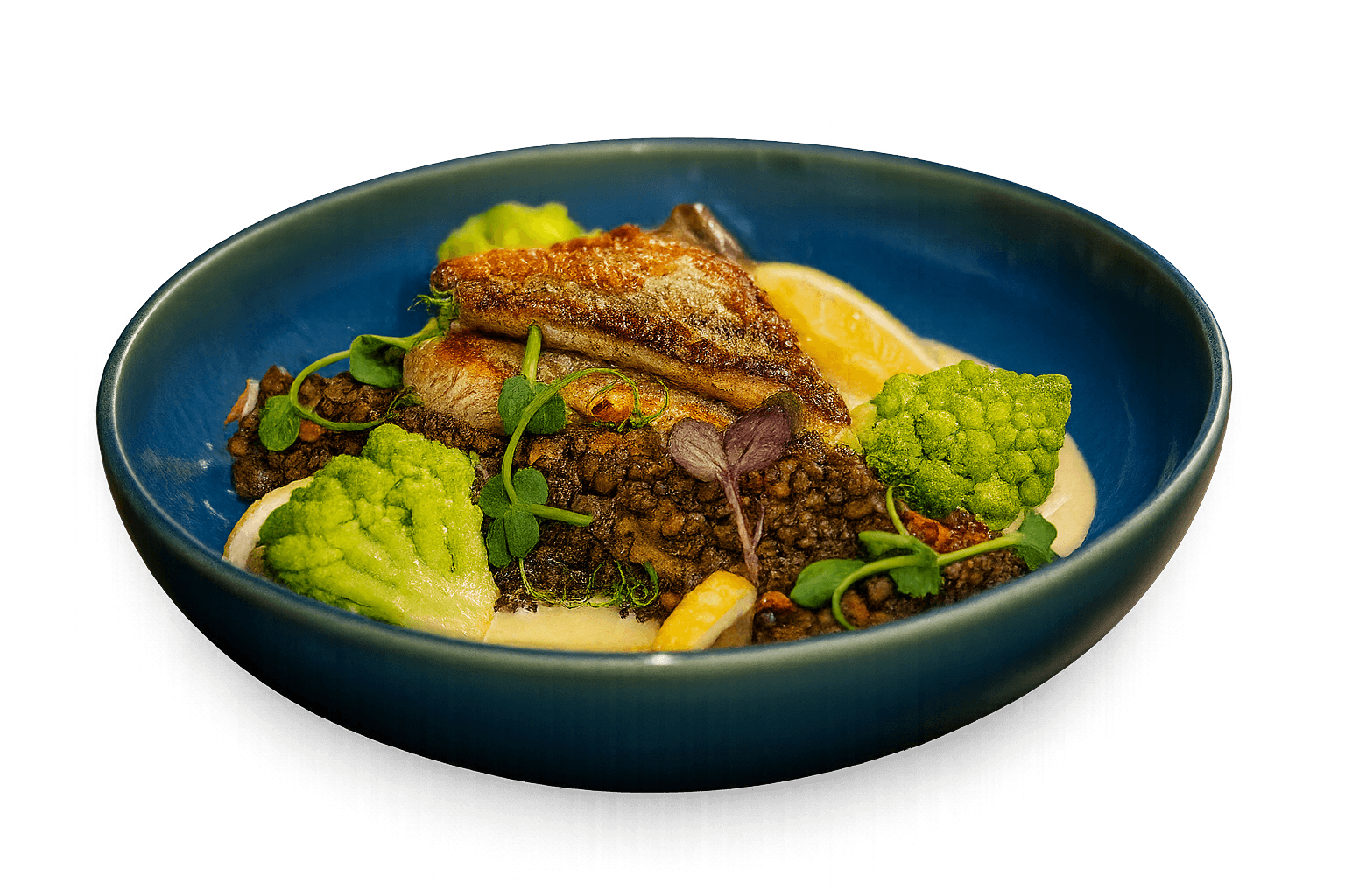 Poached zander fillet, warm beluga lentil salad, delicate roasted-lemon and dill sauce, romanesco