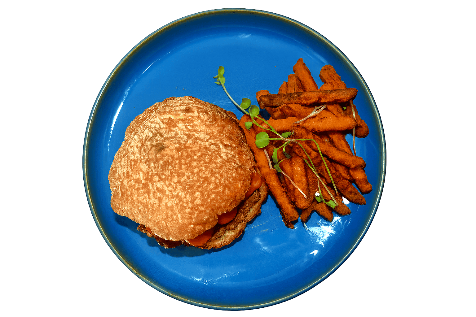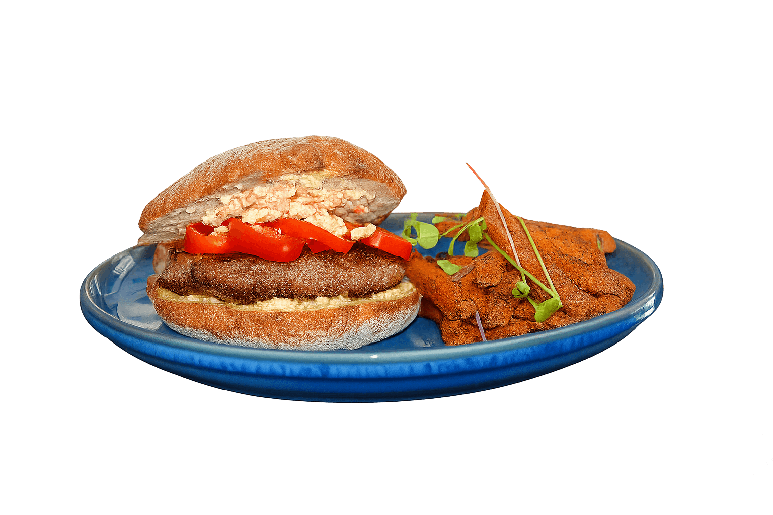 Grilled minced meat patty with pita bread, spicy cheese spread, tomato, and fries.