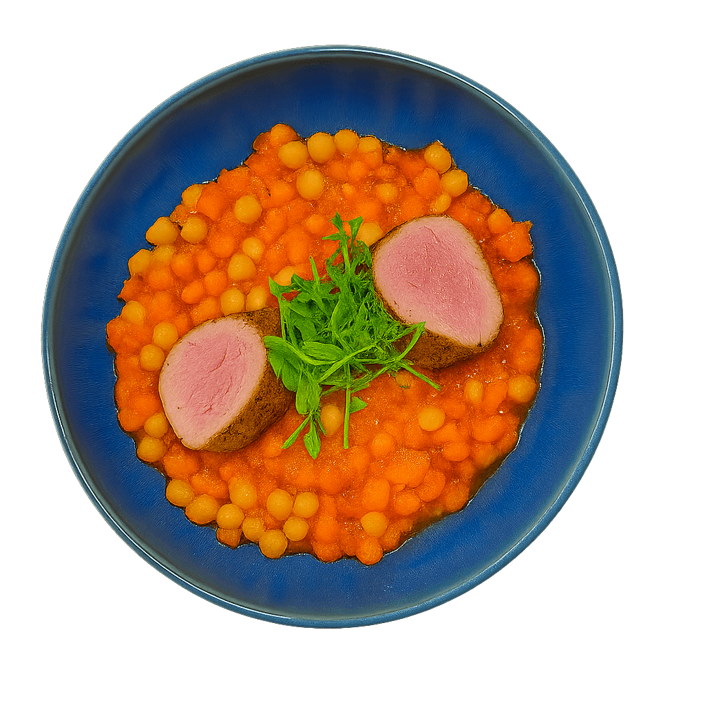 Pork tenderloin sous-vide, roasted sweet potato and chickpea ragout, tomato salsa